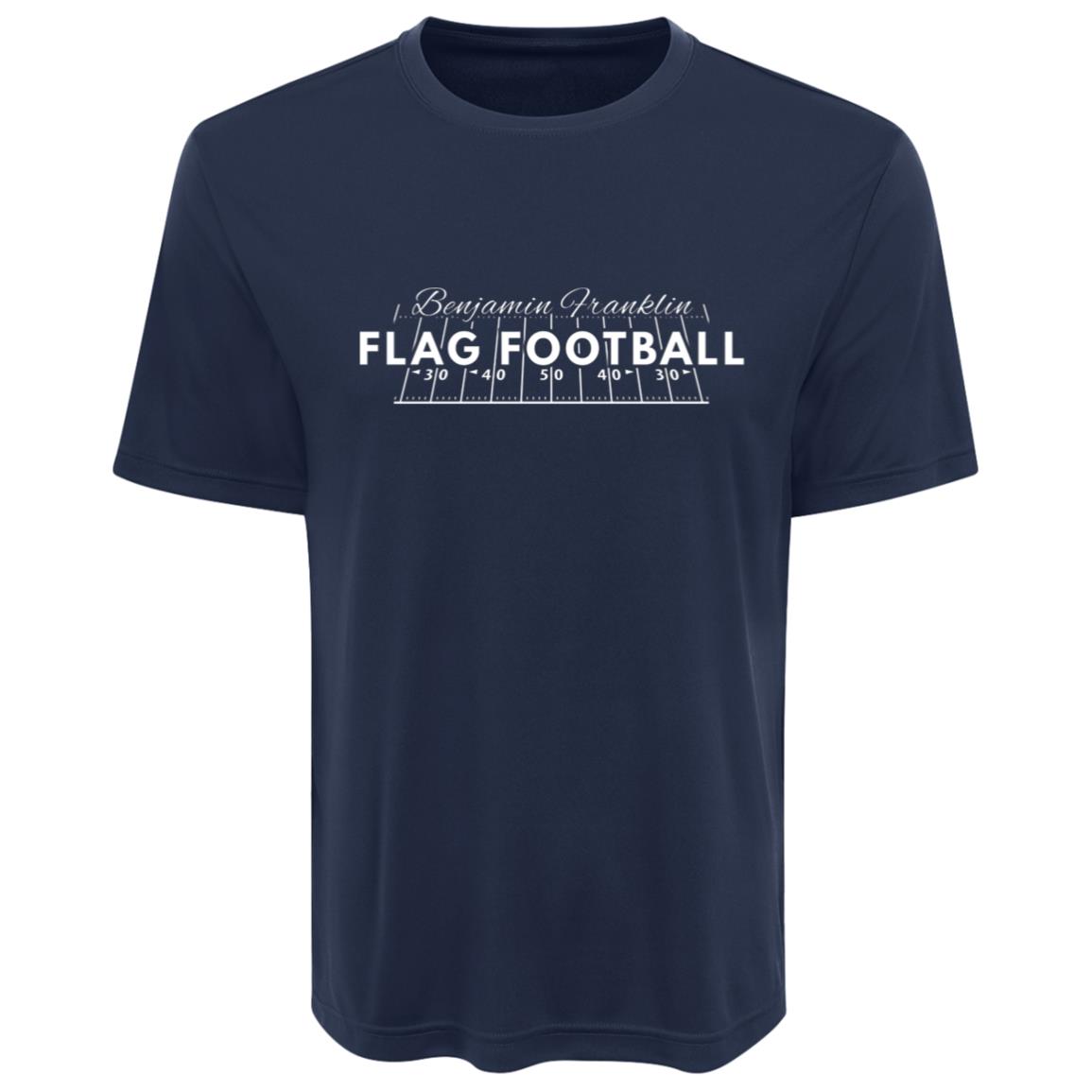 Navy moisture-wicking performance tee featuring the Benjamin Franklin Flag Football field design on the front and the “Every Decision I Make Has a Direct Impact on My Entire Team” imprint on the back. Made from 3.8 oz 100% polyester for lightweight comfort and moisture control.